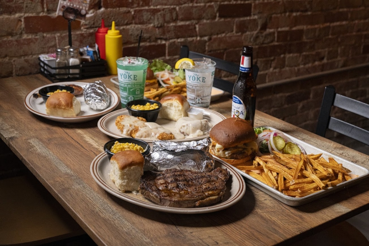 We are a full service bar and grill open 6 days a week. Our kitchen is open for Dinner Monday thru Saturday 5pm-9pm and Lunch Wed thru Friday 11am-2pm. We offer Steaks, Burgers, Pizza, Wings and other specials. Established in 2009 Located in Historic Downtown Coffeyville The Yoke Bar and Grill is the place to visit. Stop by and see our Penny Topped bar. We look forward to serving you at The Yoke where ''These Buns Are Homemade!''